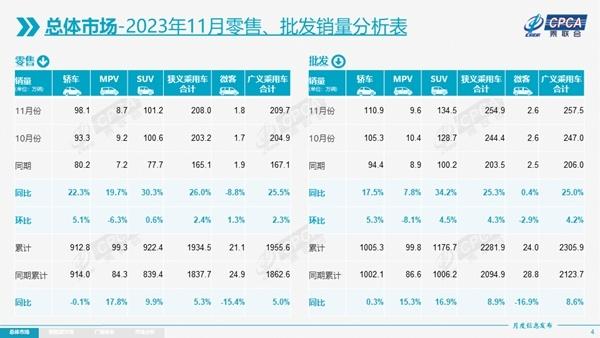 11月,國內(nèi)狹義乘用車生產(chǎn)、批發(fā)、零售端皆呈現(xiàn)同環(huán)比雙增長的有力表現(xiàn),并連續(xù)第三個月齊齊站上200萬輛關口。1-11月,狹義乘用車生產(chǎn)、批發(fā)、零售累計增速繼續(xù)擴大,分別達到7.4%、8.9%和5.3%,較1-10月各自提升1.9、1.7和2.1個百分點。