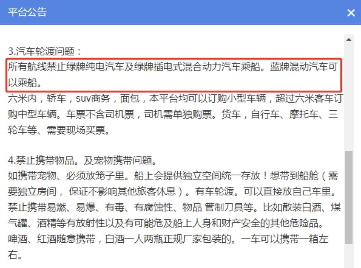 2月20日,頂端新聞致電大連海港官方客服,接線人員回復(fù)確實(shí)有此規(guī)定:“綠牌車、純電車、插電式混合動(dòng)力綠牌汽車,公司規(guī)定暫時(shí)不允許開(kāi)上輪渡的客貨滾裝船,但藍(lán)牌混動(dòng)暫無(wú)此規(guī)定。”