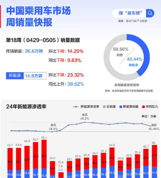 深入到2024年第18周的銷售細(xì)節(jié),即4月29日至5月5日這一時(shí)間段,我們發(fā)現(xiàn)中國汽車市場整體銷量為36.6萬輛,相較之前呈現(xiàn)出一定的下滑趨勢。其中,新能源汽車的銷量為14.8萬輛,盡管與去年同期相比仍實(shí)現(xiàn)了近40%的顯著增長,但與之前幾周相比,卻出現(xiàn)了環(huán)比下滑的態(tài)勢?;谶@些數(shù)據(jù),我們可以清晰地看到,該周新能源汽車在中國市場的滲透率為40.44%。