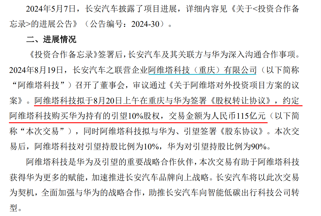 8月19日晚,長安汽車發(fā)布公告稱,聯(lián)營企業(yè)阿維塔科技擬購買華為持有的深圳引望10%股權(quán),交易金額為115億元。出資方式為現(xiàn)金出資,資金來源為阿維塔科技的自有資金。本次交易后,阿維塔科技對引望持股比例為10%,華為對引望持股比例為90%。同時,阿維塔科技擬于8月20日與華為、深圳引望簽署《股東協(xié)議》。