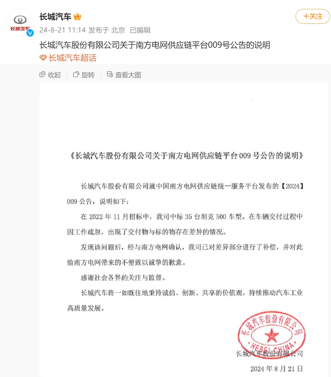 8月21日,長城汽車發(fā)布關于南方電網(wǎng)供應鏈平臺009號公告的說明。長城汽車稱,在2022年11月招標中,長城汽車中標35臺坦克500車型。在車輛交付過程中因工作疏忽,出現(xiàn)了交付物與標的物存在差異的情況。發(fā)現(xiàn)該問題后,經(jīng)與南方電網(wǎng)確認,長城汽車已對差異部分進行了補償,并對此給南方電網(wǎng)帶來的不便致以誠摯的歉意。此前,根據(jù)南方電網(wǎng)發(fā)布的供應商處理公告,長城汽車被南方電網(wǎng)列為“不接受投標”的供應商。