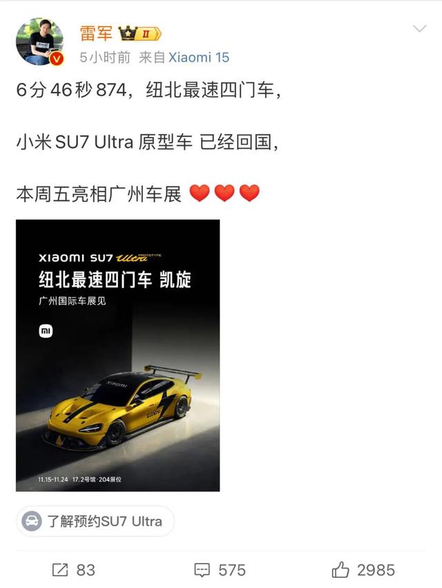 11月12日,雷軍在微博高調(diào)宣布:“小米SU7 Ultra原型車(chē)已經(jīng)回國(guó),并將于廣州車(chē)展上正式亮相。”據(jù)了解,該車(chē)定位為巔峰性能科技轎車(chē),定價(jià)為81.49萬(wàn)元。然而,即便如此,在預(yù)訂開(kāi)啟僅10分鐘內(nèi),小訂量就突破了3680臺(tái)。
