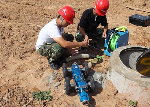 在檢測現(xiàn)場,操作手吳學(xué)文將調(diào)試好的管道機器人放入排水管道內(nèi),隨后管道機器人沿著管道前進,對內(nèi)部環(huán)境進行實時錄像,并且將圖像實時反饋到地面上的設(shè)備終端顯示器上,同時質(zhì)檢人員對管道質(zhì)量進行記錄和評價。