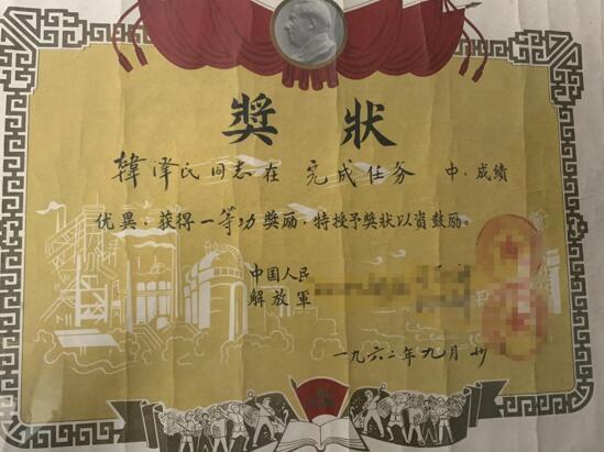 1978年,韓澤民結(jié)束了22年的軍旅生涯轉(zhuǎn)業(yè)。此后,他在電力系統(tǒng)默默無聞41年,嚴(yán)格遵守相關(guān)規(guī)定和部隊紀(jì)律,刻意塵封功績,為人低調(diào),從未向組織提過任何要求,也未要過任何待遇。直到今年八一建軍節(jié)前夕,大名縣電力部門對退休職工中有過參軍經(jīng)歷的老人上門統(tǒng)計普查時,在確認(rèn)符合相關(guān)規(guī)定、不會泄密后,韓澤民才打開那口塵封多年的老式大皮箱,把深藏的“一等功”和“提前晉級晉銜”獎狀,拿出來示人,大家才知道他有這么輝煌的過往。