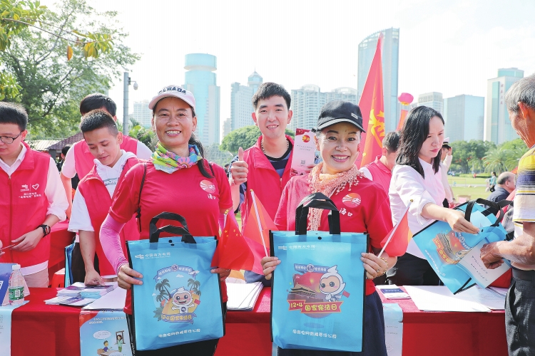 12月1日,海南省暨??谑?019年“憲法宣傳周”活動在??谑腥f綠園啟動,??诠╇娋衷诨顒蝇F(xiàn)場開展“依法用電、安全用電”宣傳。楊永光 攝