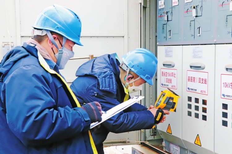 為保障云南省玉溪市華寧縣留觀點、留驗點、醫(yī)學治療點及滯留旅客安置點等防控疫情第一線的正常用電,云南電網(wǎng)公司玉溪華寧供電局組織人員對涉及線路、設備進行特巡特維,保障可靠供電。圖為該局配電管理所員工對縣醫(yī)院支線的開關柜進行測溫。 向生偉 攝