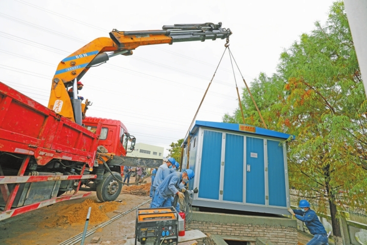 2月6日12時30分,中山市第二人民醫(yī)院臨時防疫病房全部通電!接到該擴建工程配套電氣設備及增容用電的任務,廣東電網(wǎng)公司中山供電局僅用6天時間便全部完工,比原計劃提前6天,為醫(yī)院建設提供了堅強電力保障。圖為施工人員正在吊裝變壓器箱,為通電做好設備調(diào)試工作。 譚茂茜 攝