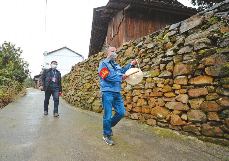 2月5日,貴州省黔東南苗族侗族自治州三穗縣八弓鎮(zhèn)高寨村響洞寨,貴州電網(wǎng)公司凱里三穗供電局駐高寨村幫扶干部羅德杰(右一)和村委干部一同,一個負責敲鑼,一個負責提著播放器,穿梭于寨子里,向村民宣傳防疫知識。 萬明忠 攝