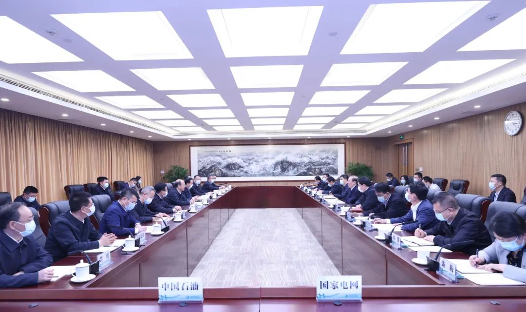 辛保安歡迎戴厚良一行到訪國家電網公司,感謝中國石油積極支持和參與新型電力系統(tǒng)技術創(chuàng)新聯(lián)盟的組建。
