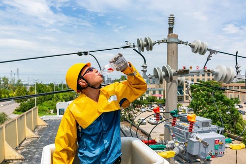 國(guó)網(wǎng)山東濟(jì)寧供電公司員工在烈日高溫下完成智能開(kāi)關(guān)更換作業(yè)后補(bǔ)充水分。