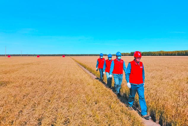 國家電網(wǎng)黑龍江電力(建三江)共產(chǎn)黨員服務(wù)隊隊員深入田間地頭服務(wù)秋收用電。王蕾 攝