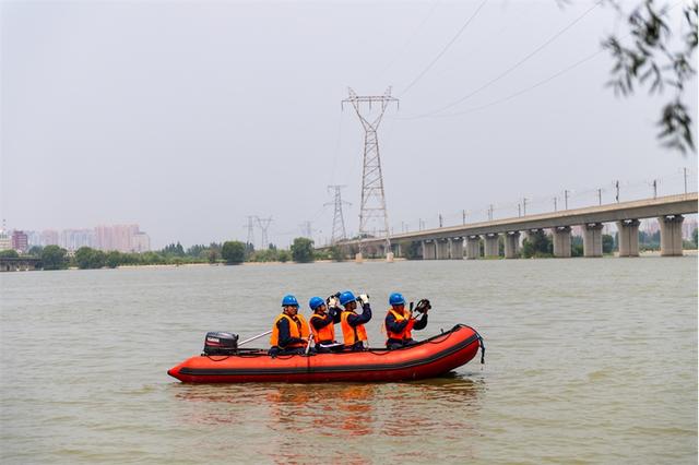 國(guó)網(wǎng)吉林四平供電公司員工乘充氣艇對(duì)處于濕地的鐵塔開展防汛特巡。