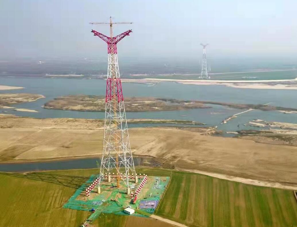 2021年12月28日,在湖北省鐘祥市磷礦鎮(zhèn)、鐘祥市豐樂鎮(zhèn)漢江之畔,歷經50余天的建設,由國網湖北送變電工程有限公司承建的白鶴灘~江蘇±800千伏特高壓直流輸電線路工程(鄂7標段)鐘祥漢江大跨越兩基跨越塔N5044 、N5045組立完成。(李健波、郭暉 攝)
