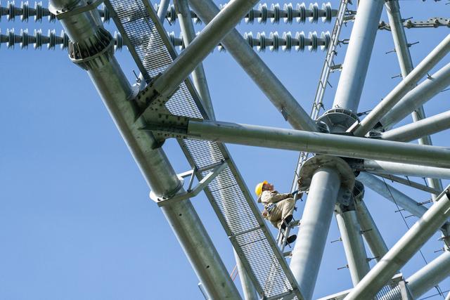 7月23日,在南荊長(zhǎng)特高壓工程荊瀟線(xiàn),電力工人爬升電塔對(duì)線(xiàn)路進(jìn)行檢修。新華社記者 陳思汗 攝