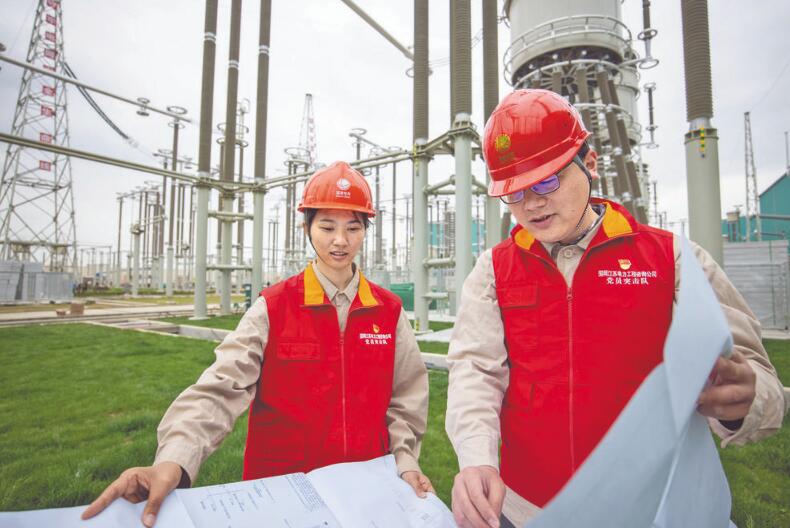 國(guó)網(wǎng)江蘇電力工程咨詢公司黨員突擊隊(duì)隊(duì)員在±800千伏姑蘇換流站工程驗(yàn)收現(xiàn)場(chǎng)對(duì)照?qǐng)D紙開展設(shè)備驗(yàn)收。董小強(qiáng) 攝