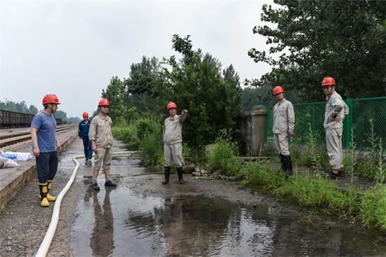 10時(shí)30分,新增的三臺(tái)排水泵及排水管送達(dá)翻車機(jī)區(qū)域,檢修人員迅速安裝后“馬力全開”開始排水。中午12時(shí),傾盆大雨間,廠長(zhǎng)江高潮與設(shè)備部、發(fā)電部、維護(hù)部機(jī)務(wù)車間、維護(hù)部電務(wù)車間負(fù)責(zé)人堅(jiān)守翻車機(jī)區(qū)域,現(xiàn)場(chǎng)坐鎮(zhèn)指揮,指導(dǎo)遷車臺(tái)排水工作。