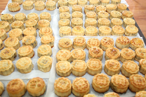 一個(gè)制作小組專(zhuān)門(mén)負(fù)責(zé)稱(chēng)面團(tuán)、稱(chēng)餡料。另一組負(fù)責(zé)包餡、壓模,先將棗泥、板栗、紫薯、豆沙等餡料揉成團(tuán),壓扁,放上一枚蛋黃,包好之后再用面皮裹上,搓圓之后,壓模成型。他們分工明確,各司其職,一個(gè)個(gè)精致月餅在他們手中誕生。將排列整齊的月餅放進(jìn)烤箱,8到10分鐘后開(kāi)烤箱,刷上一層蛋液,再烤4到5分鐘,色香味俱全的手工月餅便新鮮出爐了。“真好吃!”“這枚中秋的‘小月亮’啊,又甜又香!”“包餡的時(shí)候要注意排空氣,不然,烤的時(shí)候容易裂開(kāi)。”大家迫不及待嘗試自己的手藝,一邊不忘交流制作心得,自己動(dòng)手DIY的成就感寫(xiě)在每個(gè)人的臉上,活動(dòng)現(xiàn)場(chǎng)滿滿的都是快樂(lè)和幸福的味道。
