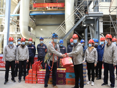 圖為慰問(wèn)人員來(lái)到鍋爐8米層為檢修人員送上節(jié)日慰問(wèn)品