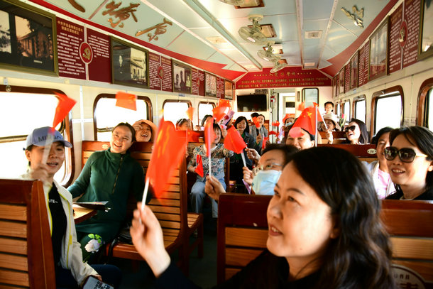 伴隨著交通列車從站臺出發(fā)的轟鳴聲,女職工們踏上位于第四節(jié)車廂的“移動書屋”。紅色米軌、星火燎原,車廂兩側(cè)的發(fā)生在滇越鐵路開遠(yuǎn)段的紅色故事主題海報,詳細(xì)記述了滇越鐵路歷史和開遠(yuǎn)火車站背后的革命故事,讓大家重溫崢嶸歲月,身臨其境地感悟開遠(yuǎn)革命的發(fā)展歷程。