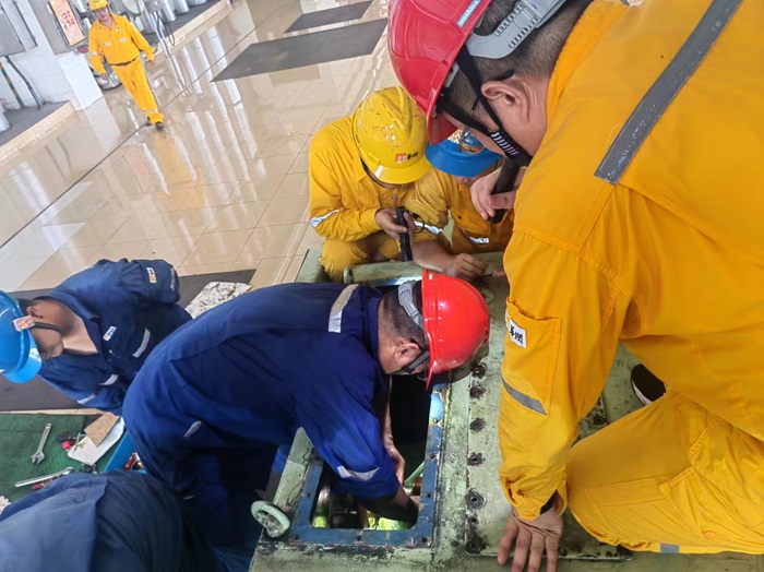 搶修位在汽輪機(jī)前箱內(nèi),操作空間小、技術(shù)要求高,且潤(rùn)滑油飛濺,油霧和油煙嗆人,環(huán)境惡劣。飛錘拆解時(shí),還出現(xiàn)螺栓咬死難題。面對(duì)諸多困難,黨員們毫不退縮,發(fā)揮黨組織的作用,群策群力,決定鉆除舊螺栓重新攻絲,最終解決難題。過(guò)程中,萬(wàn)京親力親為,俯身鉆進(jìn)前箱鉆孔攻絲,其他黨員相互協(xié)作,遞工具、清理打磨零件、制作備用螺栓等。盡管汗水濕透衣裳,無(wú)人退縮,展現(xiàn)出高職業(yè)素養(yǎng)和強(qiáng)大團(tuán)隊(duì)精神。