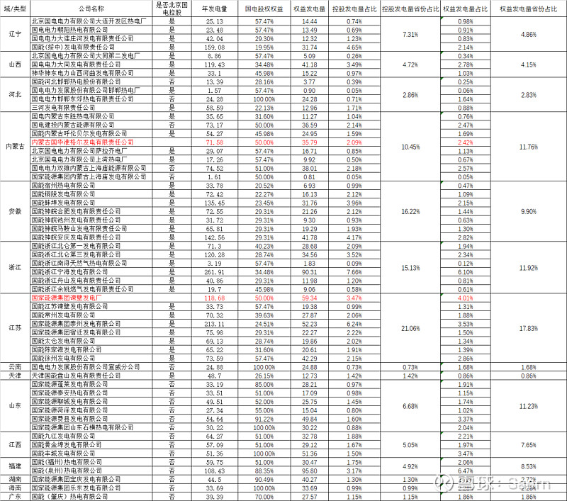國(guó)電的火電有一些明顯的特點(diǎn),就是控股火電發(fā)電量多,權(quán)益相對(duì)低,也有人質(zhì)疑國(guó)電的火電資產(chǎn)差,位置不好。那么國(guó)電的火電到底分布如何呢,經(jīng)過(guò)一個(gè)個(gè)的股權(quán)查詢(xún)(紅色兩家還沒(méi)查到用50%替代,后續(xù)翻報(bào)表后更新),按照2022年全年剝離寧夏火電后的數(shù)據(jù),我做了統(tǒng)計(jì)和分析。大家可以看結(jié)論,到底如何大家自己判斷。$國(guó)電電力(SH600795)$ $大唐發(fā)電(00991)$ $華電國(guó)際(SH600027)$ 華能?chē)?guó)際