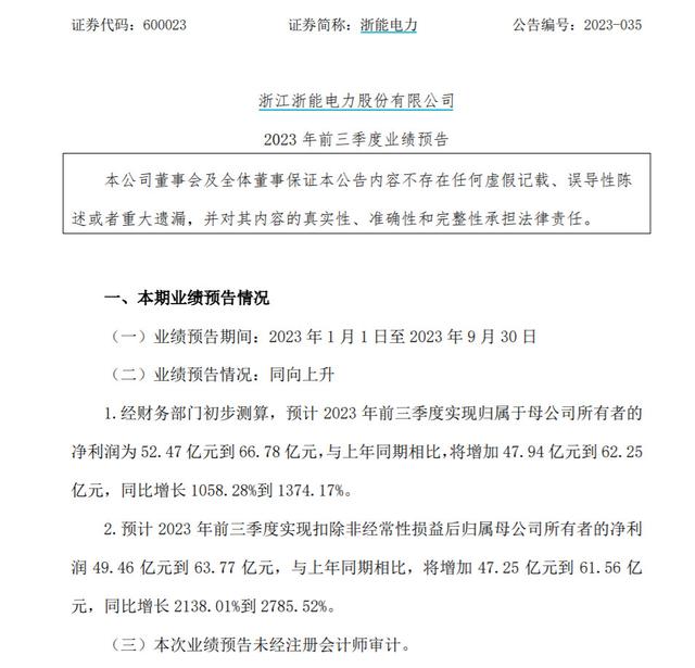 浙能電力稱,經(jīng)財(cái)務(wù)部門初步測算,預(yù)計(jì)2023年前三季度實(shí)現(xiàn)歸屬于母公司所有者的凈利潤為52.47億元到66.78億元,與上年同期相比,將增加47.94億元到62.25億元,同比增長1058.28%到1374.17%。預(yù)計(jì)2023年前三季度實(shí)現(xiàn)扣除非經(jīng)常性損益后歸屬母公司所有者的凈利潤49.46億元到63.77億元,與上年同期相比,將增加47.25億元到61.56億元,同比增長2138.01%到2785.52%。
