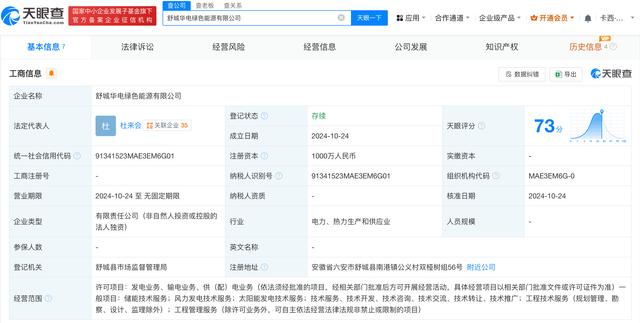 近日,舒城華電綠色能源有限公司成立,法定代表人為杜來會,注冊資本1000萬元人民幣,經(jīng)營范圍含發(fā)電業(yè)務(wù)、輸電業(yè)務(wù)、供(配)電業(yè)務(wù),儲能技術(shù)服務(wù),風(fēng)力發(fā)電技術(shù)服務(wù),太陽能發(fā)電技術(shù)服務(wù)等。股東信息顯示,該公司由華電集團旗下華電安徽新能源有限公司全資持股。
