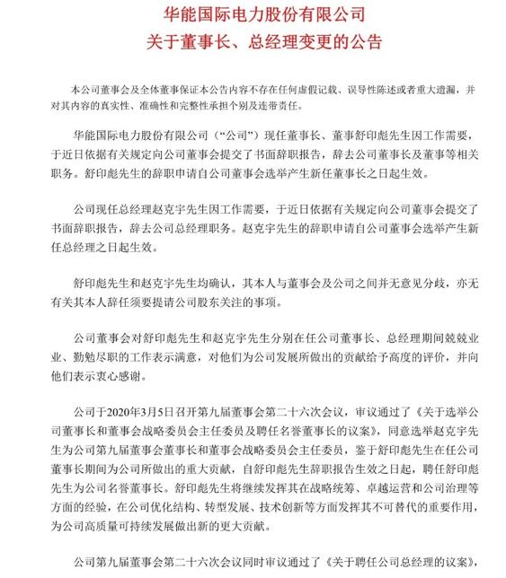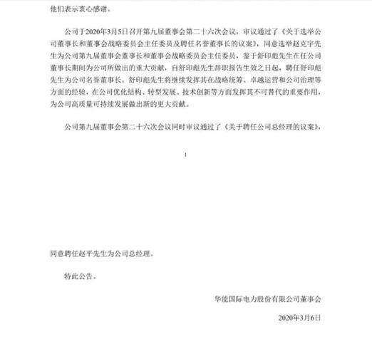 中國電力網(wǎng)訊 3月5日,華能國際電力股份有限公司發(fā)布公告,因工作需要,現(xiàn)任董事長、董事舒印彪和現(xiàn)任總經(jīng)理趙克宇于近日提交書面辭職報告,辭去相關(guān)職務(wù)。當(dāng)日,公司董事會同意選舉趙克宇為公司第九屆董事會董事長和董事會戰(zhàn)略委員會主任委員。