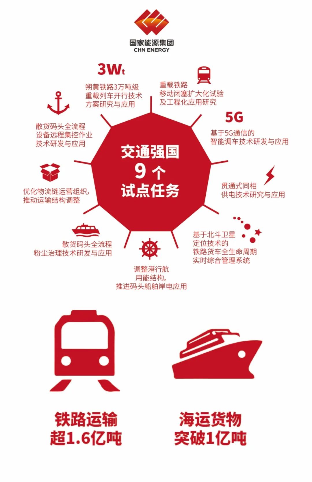為貫徹落實黨的十九大關(guān)于建設(shè)交通強國的戰(zhàn)略部署,國家能源集團承擔(dān)了《朔黃鐵路3萬噸級重載列車開行技術(shù)方案研究與應(yīng)用》《基于北斗衛(wèi)星定位技術(shù)的鐵路貨車全生命周期實時綜合管理系統(tǒng)》《重載鐵路移動閉塞擴大化試驗及工程化應(yīng)用研究》《貫通式同相供電技術(shù)研究與應(yīng)用》《基于5G通信的智能調(diào)車技術(shù)研發(fā)與應(yīng)用》《調(diào)整港行航用能結(jié)構(gòu),推進碼頭船舶岸電應(yīng)用》《散貨碼頭全流程粉塵治理技術(shù)研發(fā)與應(yīng)用》《優(yōu)化物流鏈運營組織,推動運輸結(jié)構(gòu)調(diào)整》《散貨碼頭全流程設(shè)備遠程集控作業(yè)技術(shù)研發(fā)與應(yīng)用》等9個試點任務(wù),對能源供給安全和交通強國建設(shè)起到了引領(lǐng)示范作用。