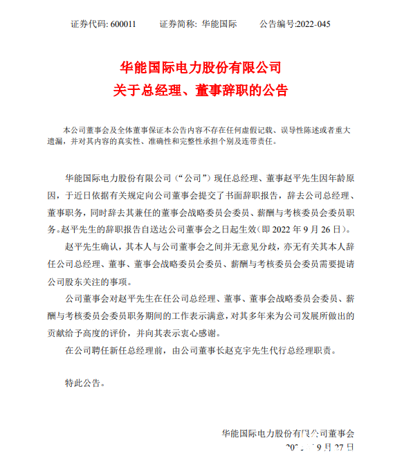 9月27日,華能國際發(fā)布關于總經(jīng)理、董事辭職的公告。華能國際現(xiàn)任總經(jīng)理、董事趙平先生因年齡原因,于近日依據(jù)有關規(guī)定向公司董事會提交了書面辭職報告,辭去公司總經(jīng)理、董事職務,同時辭去其兼任的董事會戰(zhàn)略委員會委員、薪酬與考核委員會委員職務。趙平先生的辭職報告自送達公司董事會之日起生效(即2022年9月26日)。