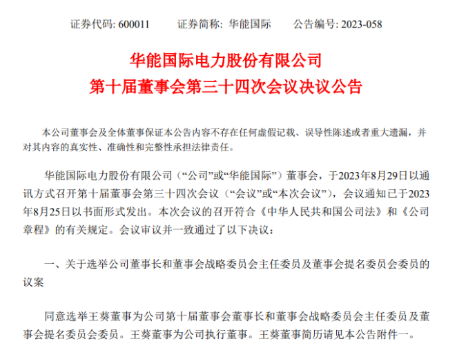 華能國(guó)際電力股份有限公司(下稱 " 華能國(guó)際 ",600011.SH)發(fā)布公告稱," 現(xiàn)任董事長(zhǎng)趙克宇先生因工作需要,于近日依據(jù)有關(guān)規(guī)定向公司董事會(huì)提交了書面辭職報(bào)告,辭去公司董事長(zhǎng)、董事、董事會(huì)戰(zhàn)略委員會(huì)主任委員、董事會(huì)提名委員會(huì)委員等相關(guān)職務(wù)。 趙克宇先生的辭職申請(qǐng),將自公司董事會(huì)選舉產(chǎn)生新任董事長(zhǎng)之日起生效。"