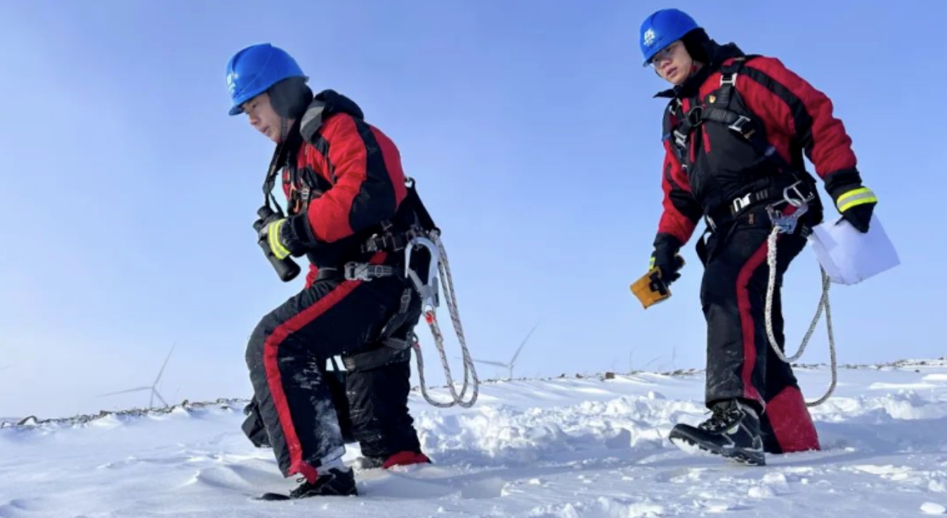 在山西,中國(guó)華電山西公司組織點(diǎn)檢員在雪后開(kāi)展風(fēng)機(jī)和集電線路巡檢工作。點(diǎn)檢員在零下十幾度的刺骨寒風(fēng)中踩著30厘米深的積雪,連續(xù)3天徒步行走50余公里,累計(jì)排查72基鐵塔,確保第一時(shí)間掌握設(shè)備情況,全力抗擊冰雪挑戰(zhàn)。