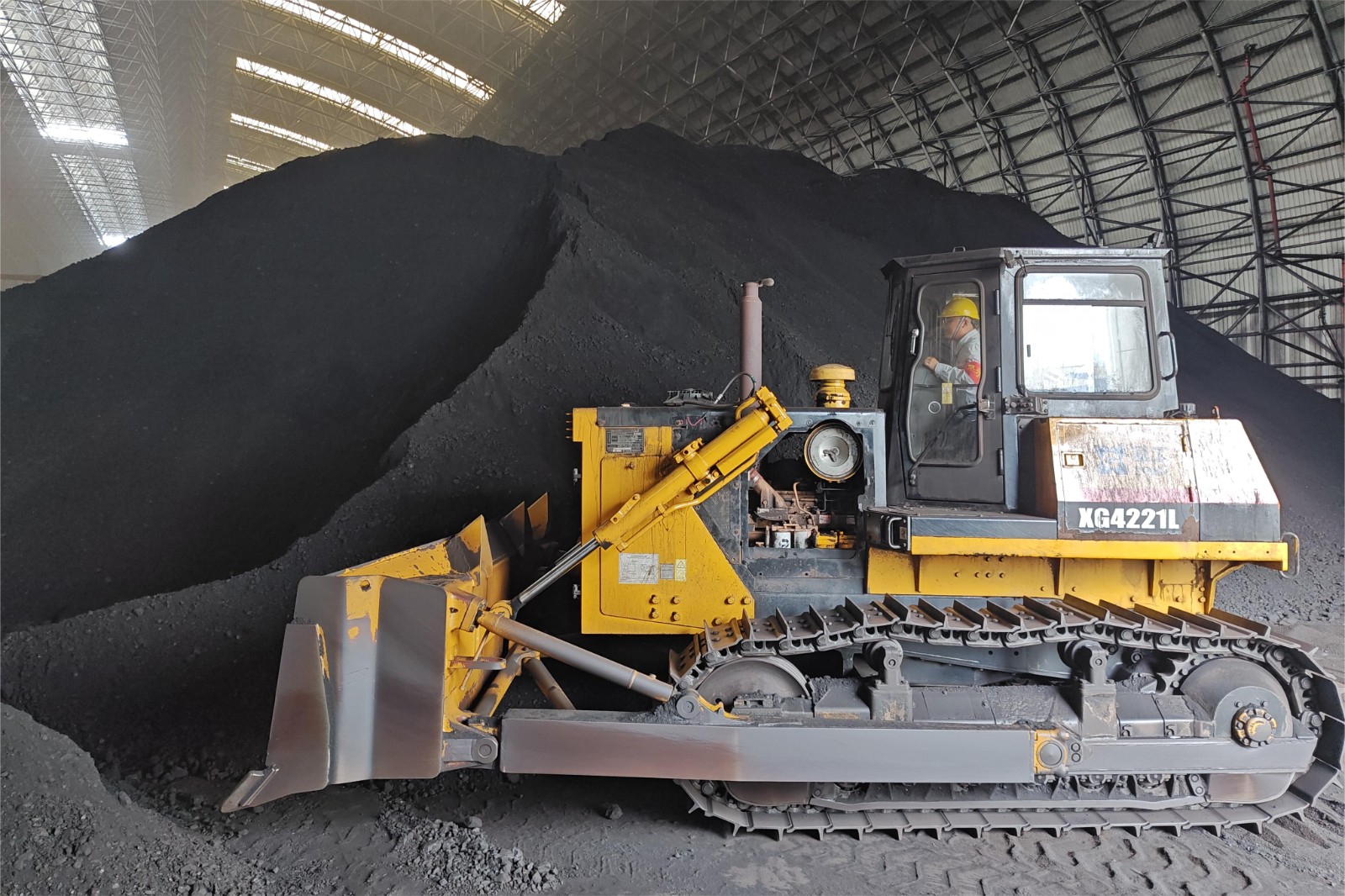 圖為樂東公司黨員通過推煤機(jī)給地斗配煤