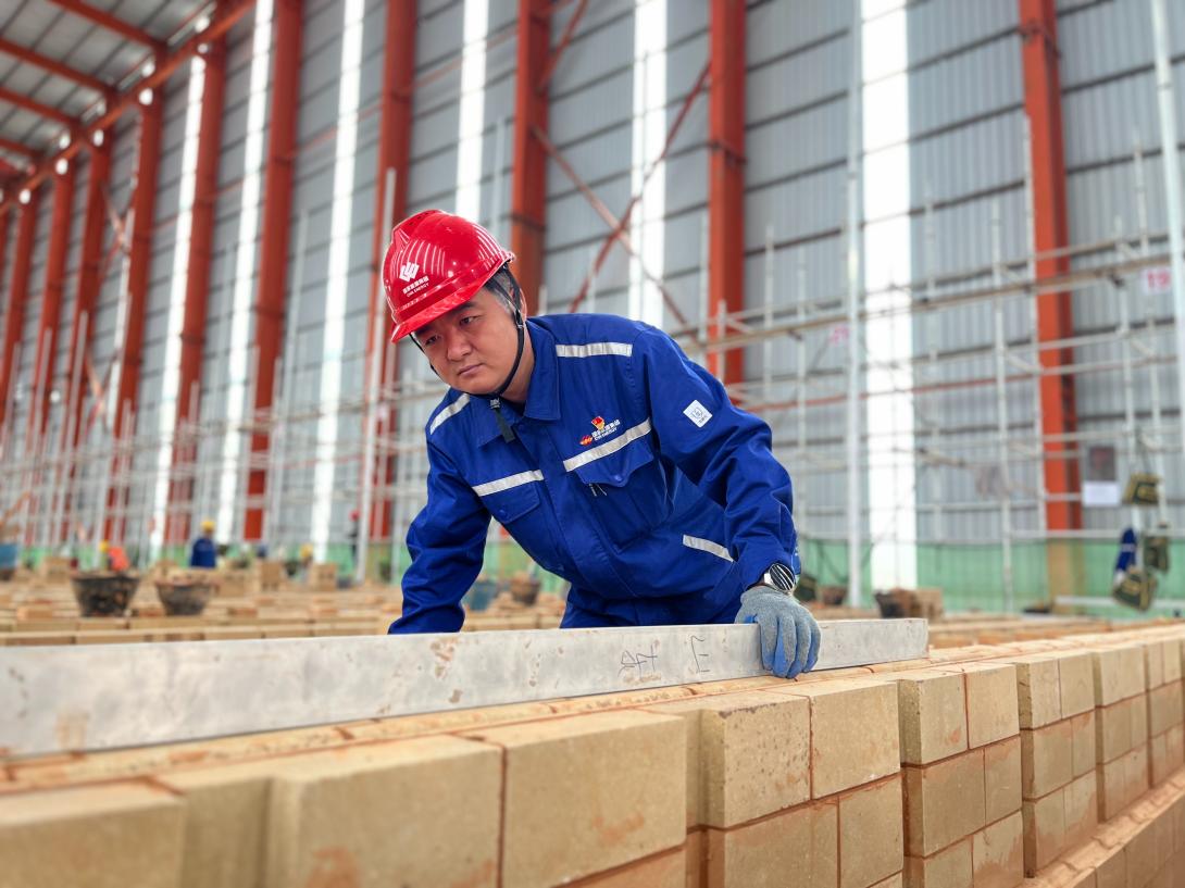 圖為360萬噸/年搗固焦項目黨員檢查焦?fàn)t砌筑平整度
