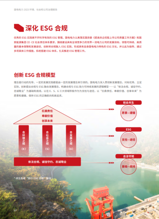 國電電力積極探索以質量為支撐、誠信為基石、社會責任為核心、品牌為名片的“四位一體”建設路徑,創(chuàng)新提出ESG合規(guī)融合發(fā)展理念,精心打造“1+N”ESG報告體系,運用ESG治理思維指導業(yè)務工作,找準生產(chǎn)、經(jīng)營和管理與ESG體系建設的融合點,為高質量推進ESG治理打下基礎,助力加快建設具有全球競爭力的世界一流電力公司。