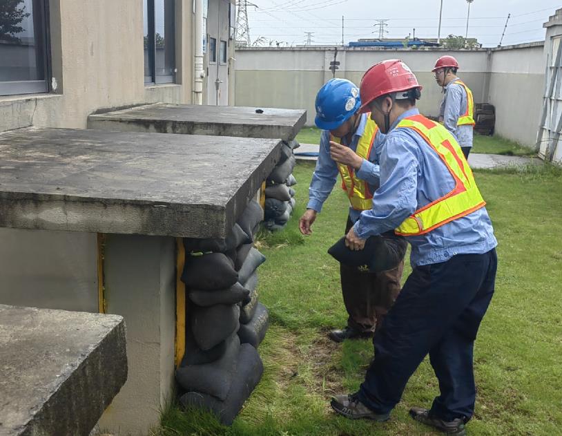 ▲上海電力長興燃機電廠一線員工在補給水泵房區(qū)域對風道口布置沙袋,確保防汛無死角。