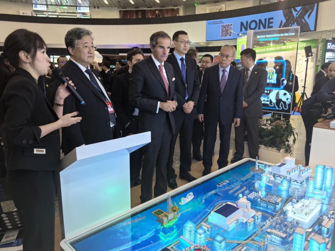 由中核集團(tuán)承辦的中國加入國際原子能機(jī)構(gòu)40周年“核創(chuàng)未來、核美家園”主題展臺吸引了全球同行的關(guān)注。在“核創(chuàng)未來、核美家園”主題展臺前,余劍鋒接待了國際原子能機(jī)構(gòu)總干事格羅西、國家核安全局局長董保同、中國國家原子能機(jī)構(gòu)副主任劉敬、中國常駐國際原子能機(jī)構(gòu)代表李松大使等重要嘉賓,體驗中國傳統(tǒng)非遺拓印,共同在紙扇上拓印出“CHINA & IAEA 40 YEARS”“核美家園”。還有來自法國、沙特、約旦、土耳其、塞爾維亞、泰國、剛果等多個國家重要嘉賓參觀展臺。