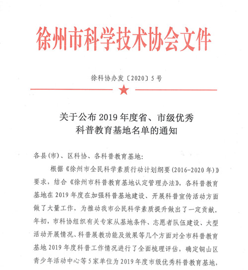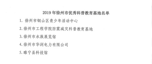 中國電力網(wǎng)訊 近日,徐州市科協(xié)發(fā)布《關(guān)于公布2019年度省、市級(jí)優(yōu)秀科普教育基地名單的通知》(徐科協(xié)辦發(fā)﹝2020﹞5號(hào)),公司在72家科普教育基地中脫穎而出,被評(píng)為2019年徐州市優(yōu)秀科普教育基地,并獲得專項(xiàng)獎(jiǎng)勵(lì),是徐州市唯一一家獲得表彰的企業(yè)類科普教育基地。