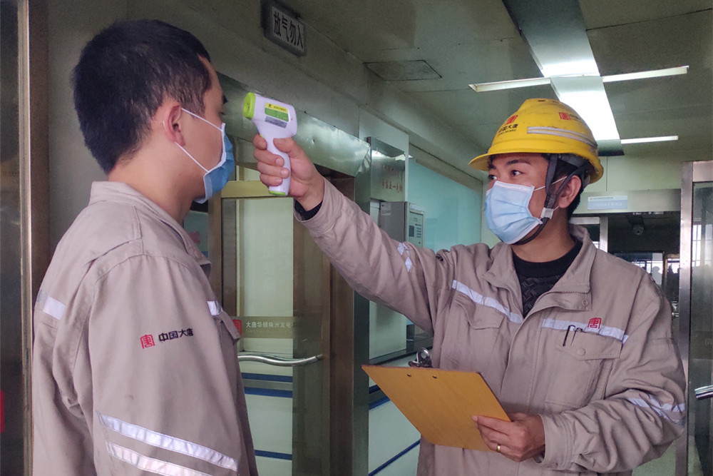 檢測體溫 方劍學(xué)是大唐華銀株洲發(fā)電公司發(fā)電部的一名集控運行主操,每天他上班都要經(jīng)過兩次體溫測量和佩戴口罩檢查。在疫情發(fā)生的第一時間,該公司迅速落實戰(zhàn)“疫”保電工作要求,實行生產(chǎn)區(qū)崗哨、集控室準入制,凡是進入公司區(qū)域的人員必須先接受檢查,做到外防輸入、內(nèi)防傳播,確保職工生命安全和機組發(fā)電安全。