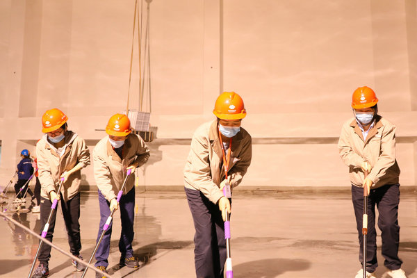 在到達位于汽機房17米平臺的GIS室后,女職工明確分工,協(xié)同配合,裝水、噴水、清掃、沖水、拖地……分區(qū)域、分小組地對GIS室地面進行清潔。當大家看著地面從塵土漫漫逐漸變成干凈整潔的地面,干凈的面龐已是塵土夾雜著汗水,臉上的笑容依舊如初,勞動的成就感,為工程建設作出力所能及貢獻的自豪感充溢著大家的內(nèi)心。經(jīng)過兩個多小時的勞動,順利完成了600平方米GIS室地面的清潔。