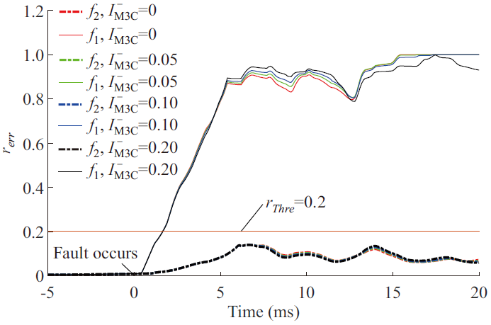 本文對(duì)圖1所示的帶有3個(gè)風(fēng)電場的低頻輸電系統(tǒng)進(jìn)行了仿真。計(jì)算結(jié)果表明:1)如圖3所示,區(qū)外故障時(shí),由本端模量信息計(jì)算的電壓反行波在故障暫態(tài)階段基本與由對(duì)端模量計(jì)算的電壓反行波重合,區(qū)內(nèi)故障下二者差異明顯;2)不同M3C負(fù)序電流指令下的電壓反行波差異仿真結(jié)果如圖4所示,結(jié)果表明,基于電壓反行波差異的縱聯(lián)保護(hù)在區(qū)內(nèi)故障時(shí)在能在5 ms內(nèi)可靠動(dòng)作,而在區(qū)外故障時(shí)不動(dòng)作。所提保護(hù)不受換流器故障控制策略影響,且具有較高的靈敏度。