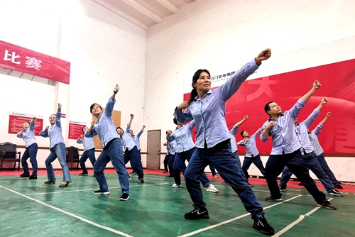 該公司職工利用工作間隙集中教學(xué)練習(xí),他們用心學(xué),認(rèn)真做,力求每個動作規(guī)范到位。“哈哈,這拉弓的姿勢,牛!”“出道了,整套動作都get到了!”通過一遍遍的練習(xí)、糾正,大家的動作越來越順暢、舒展,變得活力四射,賞心悅目。