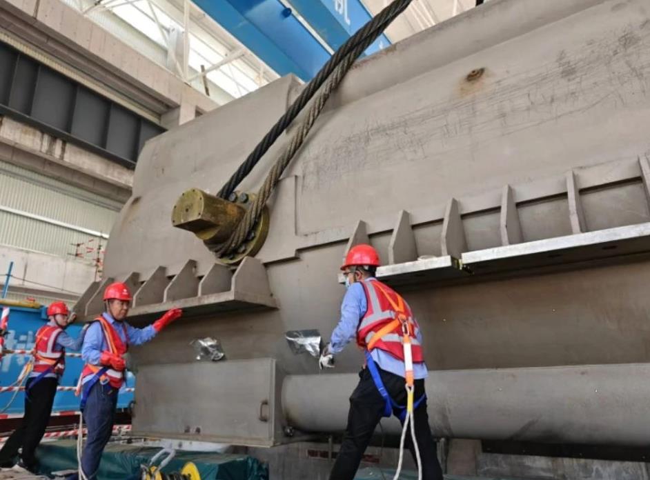 發(fā)電機(jī)定子作為主廠房?jī)?nèi)最重的單體設(shè)備,長(zhǎng)10.3米、寬4.868米、高4.7米,重達(dá)367噸。為確保發(fā)電機(jī)定子吊裝平穩(wěn)、就位精準(zhǔn),項(xiàng)目建設(shè)團(tuán)隊(duì)組織制定詳細(xì)的吊裝施工方案,提前做好設(shè)備和工器具保障,從場(chǎng)外運(yùn)輸至場(chǎng)內(nèi)卸車全過程反復(fù)推演,逐項(xiàng)落實(shí)。同時(shí),在吊裝期間實(shí)施全程監(jiān)督,嚴(yán)控安全質(zhì)量,確保整個(gè)吊裝過程安全、有序、可控。