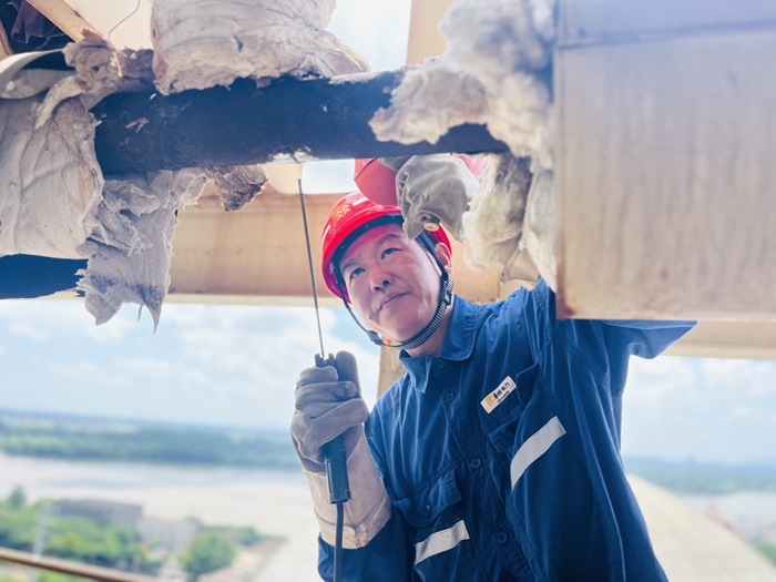 在南熱廠區(qū),老員工湯勝寶正帶領(lǐng)著他的工作小組,為鋪排管道做準(zhǔn)備工作,他還有不到一年的時(shí)間就要退休,但他仍然老當(dāng)益壯,在室外43度以上的烈日下,肩扛手抬著一根根鋼管。幾根鋼管抬放就位后,他累得滿臉是汗,氣喘吁吁,但他性格要強(qiáng),不服老,依然說(shuō)著:沒(méi)事,這點(diǎn)活算不了什么。
