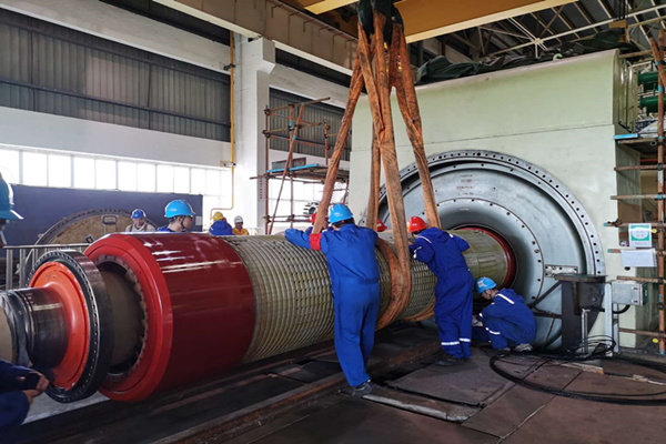 上午10時10分,隨著起重指揮人員的一聲哨響,發(fā)電機(jī)穿裝轉(zhuǎn)子工作正式開始,穿裝期間,各專業(yè)人員分工有序,密切配合,時刻注意轉(zhuǎn)子與定子的間隙,及時調(diào)整轉(zhuǎn)子的傳入量和中心位置,每一步都做到精益求精。整個穿入過程中,公司各部門負(fù)責(zé)人、專工現(xiàn)場旁站監(jiān)督,協(xié)調(diào)工作,為穿裝轉(zhuǎn)子作業(yè)的順利進(jìn)行,提供了可靠保障。