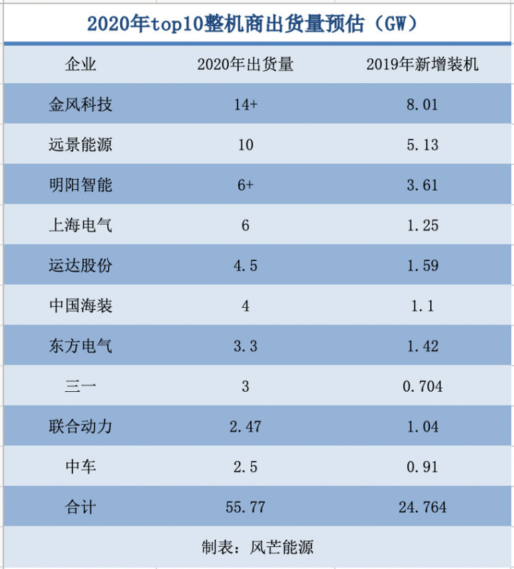 根據(jù)風(fēng)芒能源問詢、統(tǒng)計以及預(yù)估,2020年全年,排名前十的整機(jī)商出貨量將超過50GW左右。相較于光伏行業(yè)動態(tài)變化的集中趨勢,風(fēng)電整機(jī)商的排名及市占率基本保持穩(wěn)定。其中,TOP3的整機(jī)商金風(fēng)科技、遠(yuǎn)景能源、明陽智能累計出貨量超過30GW,三家市場占比最終預(yù)計在60%左右,與2019年的62.6%比,雖受搶裝影響,三家市占率稍有減弱,但行業(yè)集中度基本未受影響。