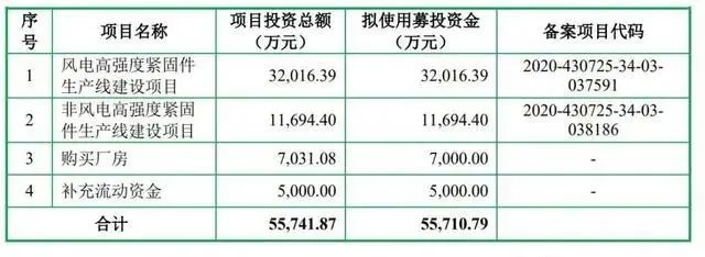 本次IPO,飛沃科技公開發(fā)行A股股票1347萬(wàn)股,發(fā)行價(jià)格72.5元/股,募集資金總額約為9.77億元,擬用于風(fēng)電高強(qiáng)度緊固件生產(chǎn)線建設(shè)項(xiàng)目、非風(fēng)電高強(qiáng)度緊固件生產(chǎn)線建設(shè)項(xiàng)目、購(gòu)買廠房、補(bǔ)充流動(dòng)資金等。