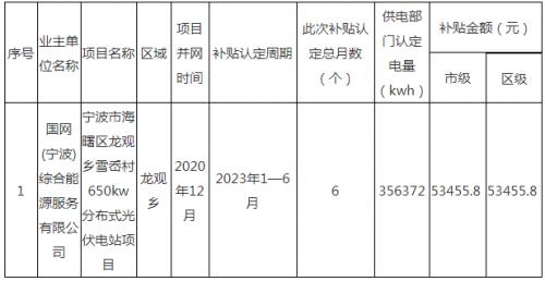根據(jù)《寧波市家庭屋頂光伏補(bǔ)貼專項資金管理暫行辦法》(甬發(fā)改能源〔2018〕36號)、《海曙區(qū)節(jié)能降耗專項資金管理辦法》(海發(fā)改〔2019〕36號)等文件精神,海曙區(qū)2023年上半年符合非自然人家庭屋頂光伏發(fā)電補(bǔ)貼項目共1個,總并網(wǎng)容量650kw,2023年上半年補(bǔ)貼發(fā)電周期為2023年1月1日至2023年6月30日,合計發(fā)電量356372千瓦時,需撥付補(bǔ)貼資金106911.6元(其中:市級補(bǔ)貼資金53455.8元,區(qū)級配套補(bǔ)助資金53455.8元)。
