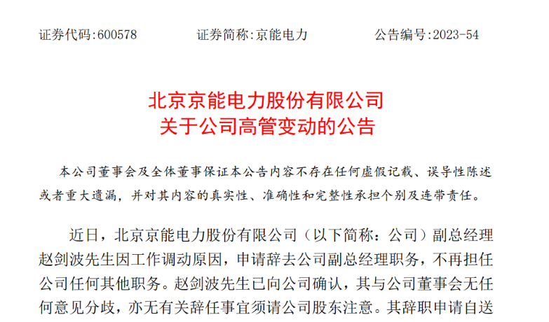 公告披露,近日,京能電力副總經(jīng)理趙劍波先生因工作調(diào)動(dòng)原因,申請(qǐng)辭去公司副總經(jīng)理職務(wù),不再擔(dān)任公司任何其他職務(wù)。趙劍波先生已向公司確認(rèn),其與公司董事會(huì)無任何意見分歧,亦無有關(guān)辭任事宜須請(qǐng)公司股東注意。其辭職申請(qǐng)自送達(dá)公司董事會(huì)時(shí)生效。本次人事變動(dòng)不會(huì)影響公司相關(guān)工作的正常開展。