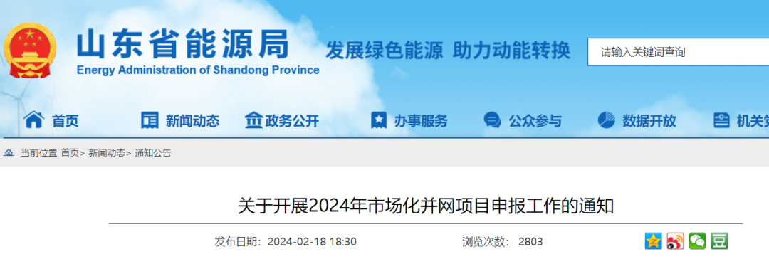 2月18日,山東省能源局發(fā)布《關于開展2024年市場化并網(wǎng)項目申報工作的通知》。